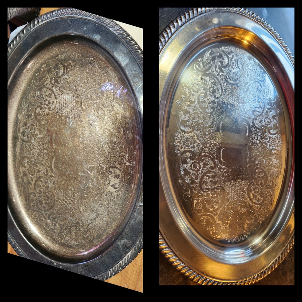 I have been slowly collecting silver dishes from the thrift store! I got a new one but it was so super duper tarnished l! But its okay! I have silver polish! Tadaaaaa! Tonight I’m thankful for my $1 dish, and my gifted silver polish! She’s so shinnnayyyy!!
