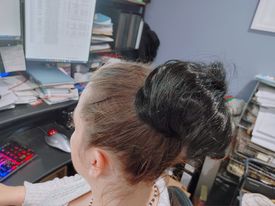 One kiddo ordered a messy bun hair accessory. Only, her hair was too thick for the bun to work. So . . thinking this could help her thin-haired Momma, she tried it on me. 🙂 And here is the result! This is not a style I will be sporting any time soon 🤣🤣
