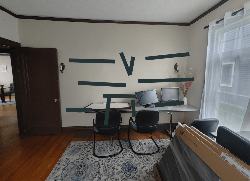 See, the box kind of thing in the middle? That is where the fireplace will go 🙂 An electric one . . because I get cold and I’ve always wanted a fireplace in my office! The “V” line is where something artsy will go. And all the lines will be random book shelves! I love it!! Trust me, it will look better as a finished product!