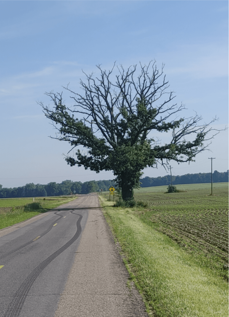 This tree . . the hubster calls it the Halloween tree. For awhile I thought it was covered in vines, and that was why there is green, because the top of the tree is obviously not alive.