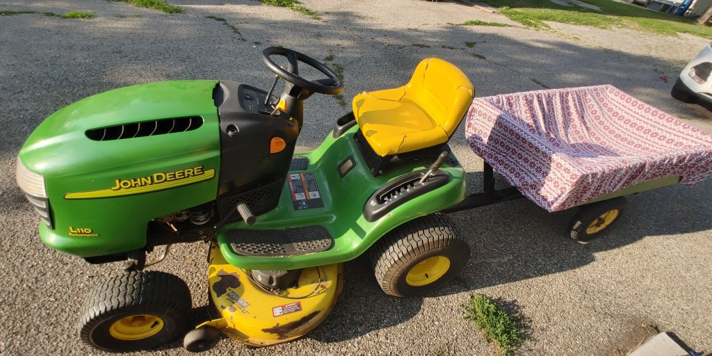 There is a sheet over a metal lawn mower trailer. But why?