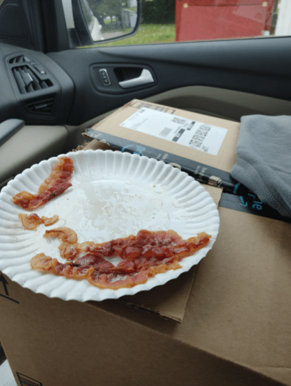 I quickly fled to my car. I thought perhaps I was quick enough that my outside cats did not smell my bacon. But they did.