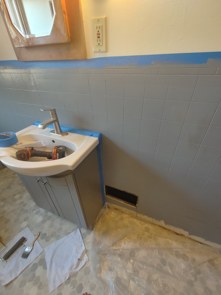 - The gray paint for the bathroom was supposed to be a very light gray. I wanted it to contrast with the sink vanity. Nope! It was about the same shade of grey as the vanity. That is NOT what I wanted. This is a smaller bathroom and it can’t be too dark.