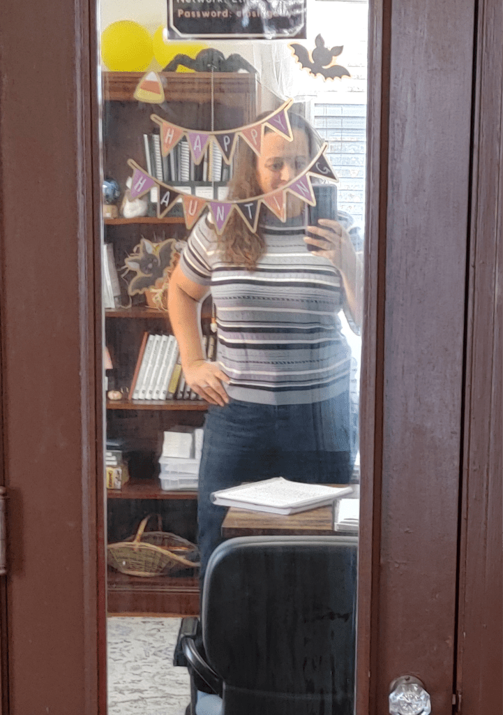 Today I wore a cute black sweater with a white ghost and the word “Boo” on it. It is quite adorable if you ask me! But, it may not be considered super professional . .