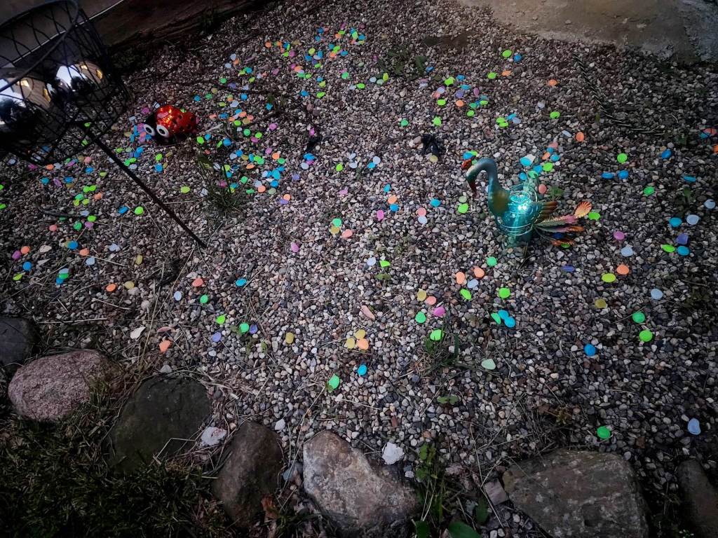 In this picture there are glow in the dark rocks and two solar creatures! A lady bug and a peacock! This is the solar garden. Soon there will a solar, light up flamingo! This is the “fun” solar garden!