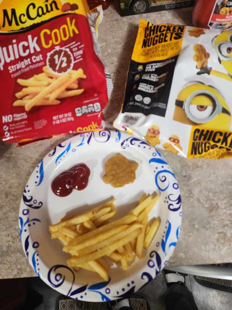 Sadly, I must report that the Minion nuggies were kind of “meh”. But, most frozen breaded chicken is nothing to write home about. The absolute best frozen breaded chicken is a tender cut. It comes in a sizeable white box and is sold at Sam’s Club. Everyone in the family likes that chicken!