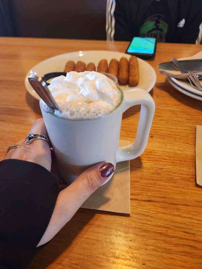 Today was one of those cold days! I was chilly most of the morning. Then after going thru a parking lot in to the cold car, I got worse. My kiddo talked me in to lunch at Applebee’s, and I had a gift card in my purse! I took my coat in with me! The very nice waitress was telling us about the drink specials and mentioned hot chocolate!! I didn’t know Applebee’s served hot chocolate!
