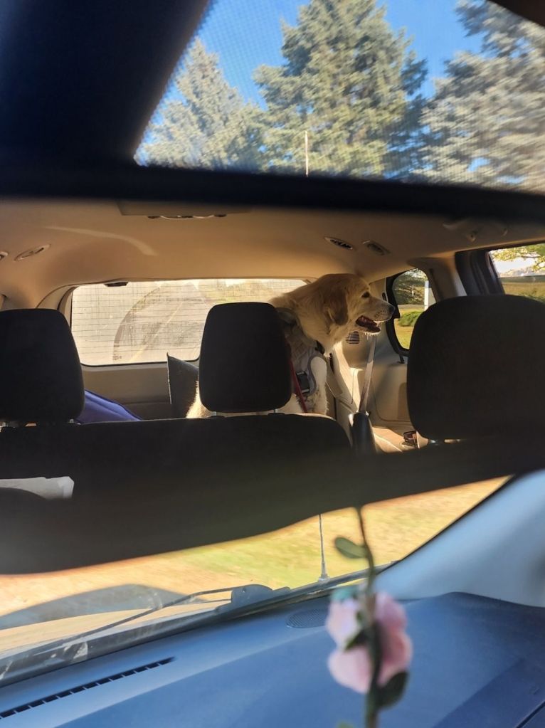 Except, she got car sick. A person can clean up a backseat of dog vomit only so many times before socialization seems way less important than it once did!