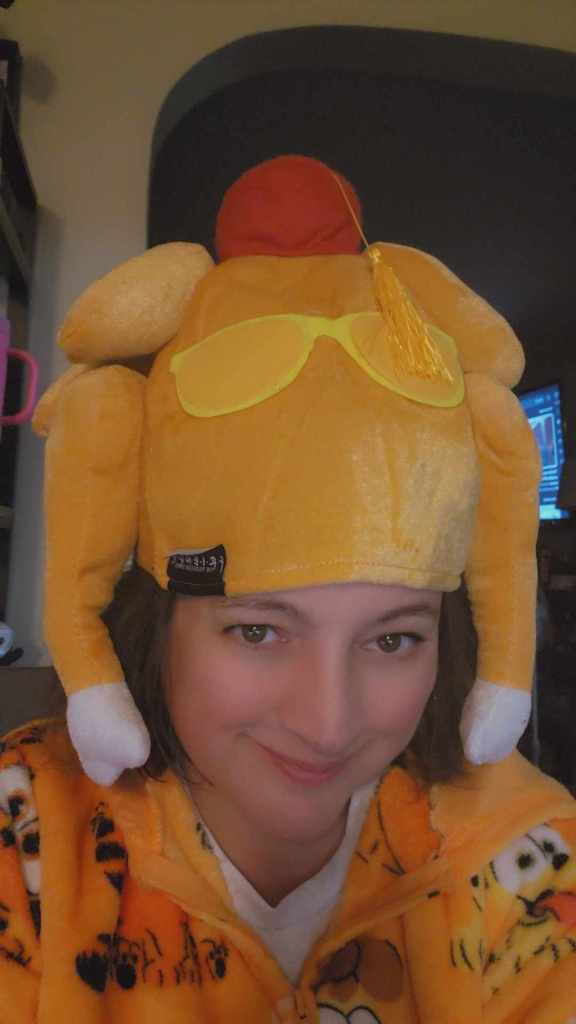 For Halloween, I wore my smiling ghost sweatshirt, with my Garfield onesie, topped briefly with a Friend’s turkey hat. 🤣