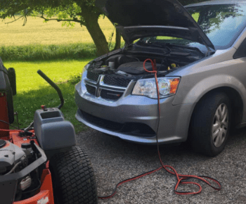The hubster’s car was off being repaired. We got out to my car so I could take him to work and it wouldn’t start. Brought out the lawn mower to try to jump the battery and it wouldn’t work.